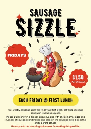 Our P&C run Sausage Sizzle each Friday at Lunch 1. Order online through the P&C Flexischools system or use a ziplock plastic bag with your child's name/class/order on it with money it, placed in the SAUSAGE SIZZLE box on the office steps on Friday mornings before 9.00am.