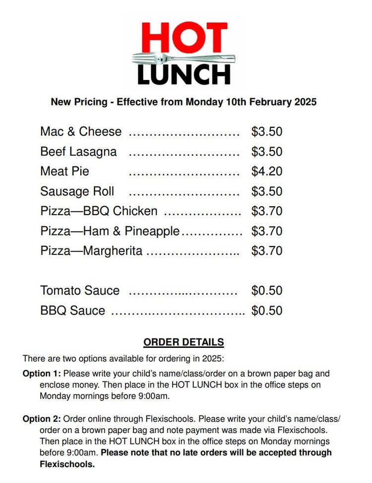Order online through the P&C Flexischools payment system or use a brown paper bag with child's name/class/order on it with money in it, placed in the HOT LUNCH box on the office steps on Monday mornings before 9.00am.